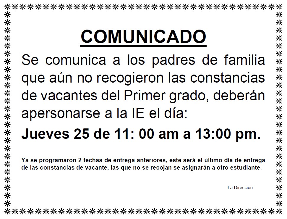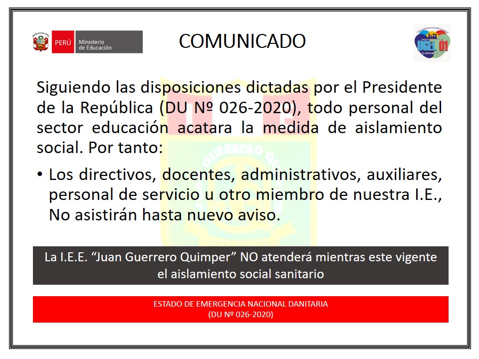 | 22/12/2022 | Comunicado sobre Vacantes 2023 IEE "Juan Guerrero Quimper" - Descargar Aquí |