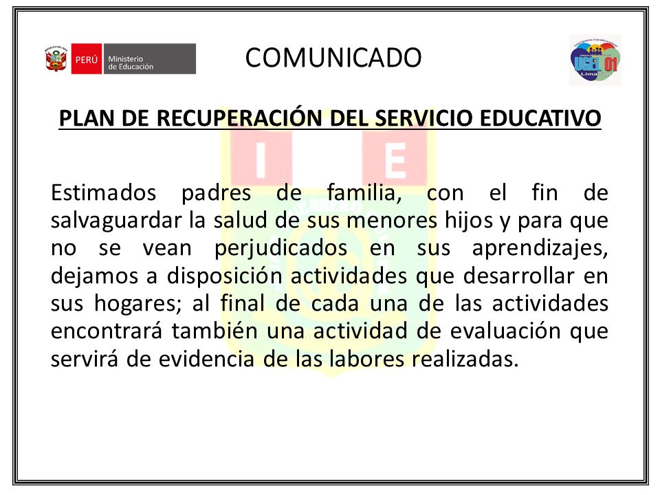 | 22/03/2020 | Comunicado: Yo aprendo desde casa - Descargar Aqui |
